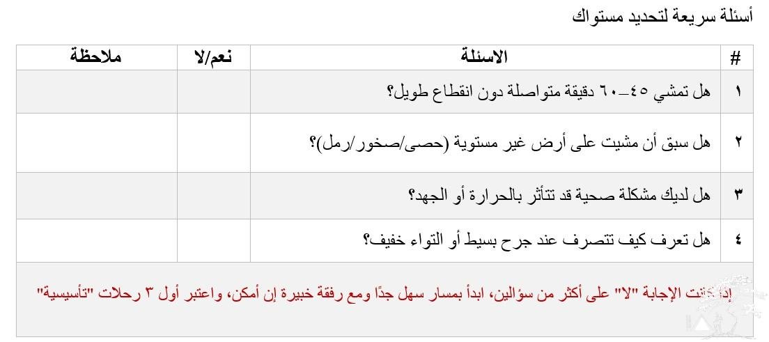 - للمبتدئ: لا تخرج وحدك، ويفضل أن تكون المجموعة صغيرة ومنسجمة.