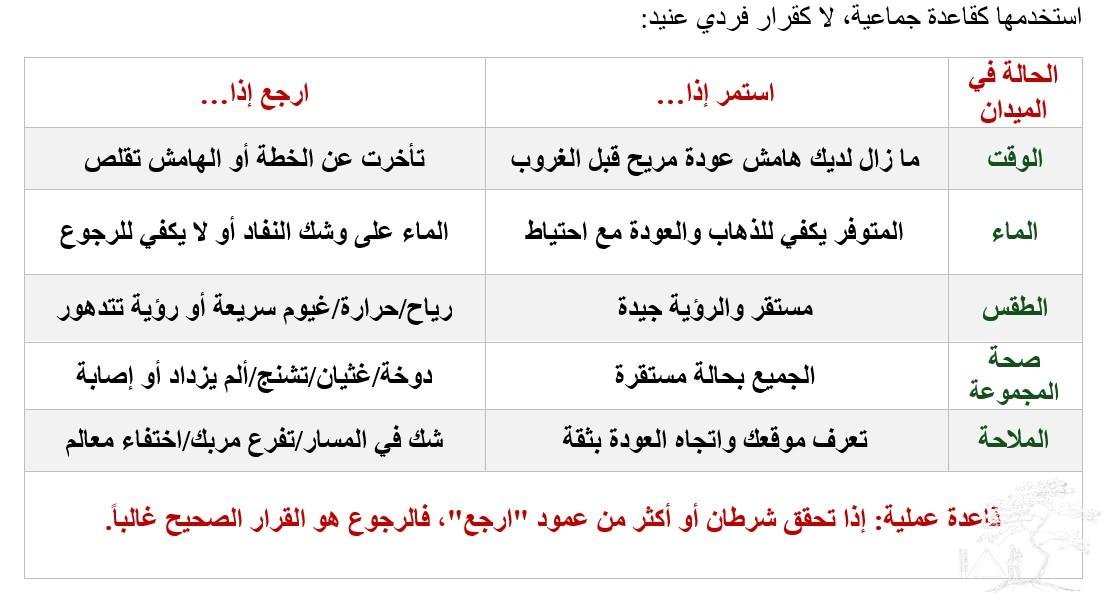 إذا تقلص هامش الوقت، أو بدأ الماء ينفد، أو ساء الطقس، أو ظهرت أعراض تعب غير طبيعية، أو أصبح اتجاهك غير مؤكد. ارجع. القرار المبكر أسهل وأمن.